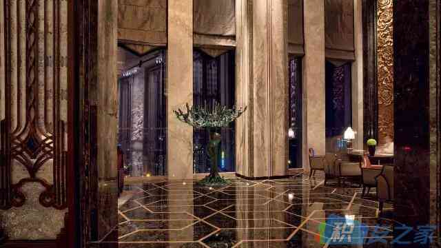 大堂采光极佳,阳光投射在巨幅玉璧上翠色满屋、晶莹剔透,整面墙上的翠玉雕刻着“天府盛景图”,由三幅独立玉雕组成,分别呈现了青城山、望江楼以及都江堰的绝美风光。地面大理石材分割方式是由“千古之谜”的三星堆青铜器图案中提炼而成,两者遥相呼应,诠释着传承数千年的蜀地文化。雍容华贵的芙蓉花作为大堂主灯,灵动华美。在空中大堂的空间和立面细节上,沉稳的建筑气场再度呈现,令整个空间天、地、壁结合得浑然天成,隐隐寓意着蜀地之美夺天地造化。