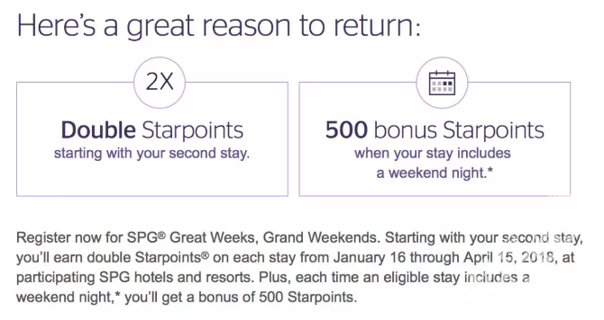 促销内容:从活动期间的第二次入住(stay)开始,每次入住额外获得2x积分,如果包含周末则每个stay额外再获得500分。