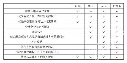 在 Adagio access 酒店,普通卡以上级别可享受全球免费上网,银卡以上级别可延迟退房,金卡以上级别赠送一杯迎宾饮料,且可提前登记入住。