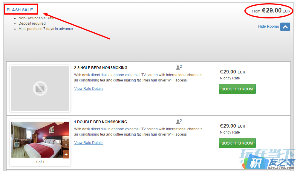 大家在预定的时候,Rate那选择“FLASH SALE”,比如Holiday Inn Garden Court in France的价格就只要€ 29.00: