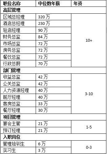 有的人说,酒店工作薪酬低、待遇差、晋升难,但其实只是你没有进入高端的国际化酒店,没有选择真正适合自己发展的岗位,没有在入职之前提升好自己的专业技能、外语能力和经验技巧,没有在培训或做基础岗位的时候都不断学习与积累,最后一点,没有坚持。从薪酬统计表中不难发现,如果想做到项目管理者一般需要1-5年,部门管理者需要3-10年,高层管理者级别则需要10年以上的奋斗与坚持,当然,薪酬与待遇也会随着岗位的晋升,不断翻倍增长。