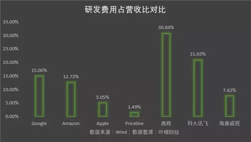 比较诡异的是,2017年携程研发费用高达83亿美元,占营收的比重高达30%以上!全球在线旅游网站龙头 Priceline的研发费用占当年营收的比例才仅为1.5%。携程这种研发费用投入力度,远超其他高科技企业,谷歌、亚马逊、海康威视、科大讯飞都比不上。