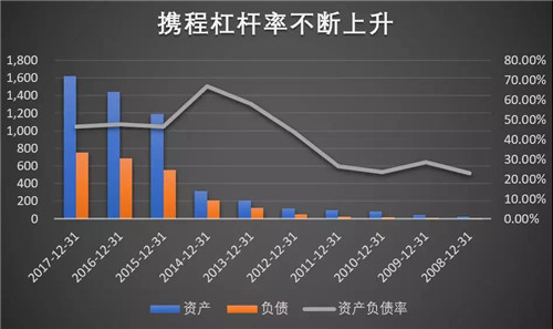 携程负债规模的膨胀速度令人瞠目结舌。2008年,携程负债规模才6亿,2017年达到756亿,增幅高达126倍!