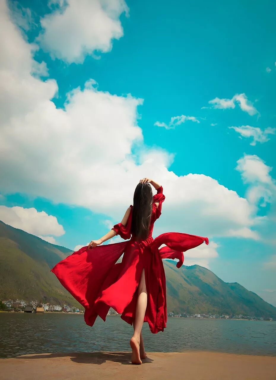 七月的青海湖,蓝、黄、白组成世界上最美的画卷,有水天相接的青海湖做背景,正是姑娘们拍照的好时机。