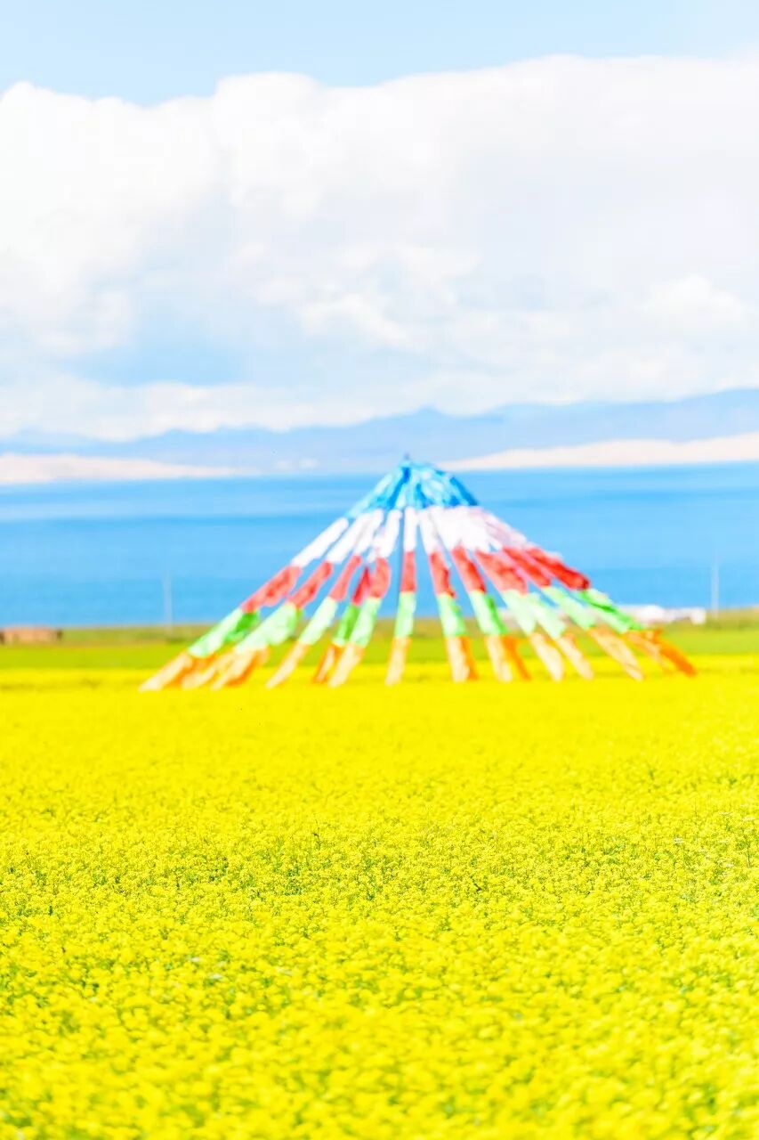 青海的油菜花铺天盖地,更适合远摄,可以捕捉到五彩的经幡,镜头里都是广阔、壮美、藏味十足的风光。