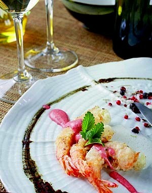 2. 大虾洗净,用盐调味后蘸上玉米淀粉调成的面浆,然后用橄榄油炸熟。