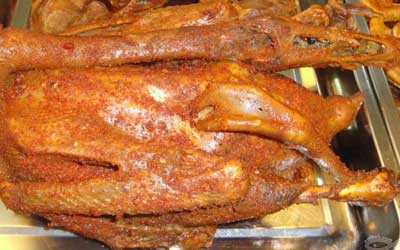 岚谷熏鹅 按传统制作熏鹅法,一灶足已。先将鹅肉煮熟,然后再涂抹上辣椒、白盐、味精、上等油,其次将涂抹好了的熏鹅架于底下放着糯米(桂叶、茶叶等)的锅中,用柴火烧到一定程度的时候,一只岚谷熏鹅就出炉了。当然,写起来简单,但在制作的过程中却涉及许多技术“玄机”。据熏鹅店主介绍,他们一般是在凌晨开始制作,早晨七八点钟的时候,顾客就可看到货柜上的热乎乎香喷喷的熏鹅了。